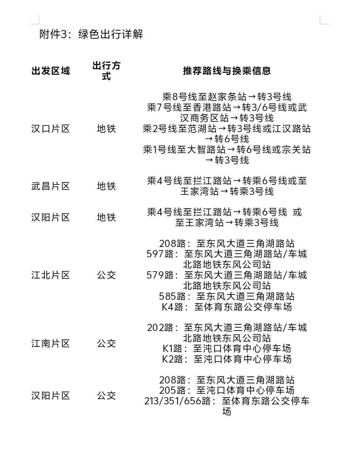 1、活动期间观众较多,体育中心周边道路通车流增加,前往体育中心周边的人员请尽量错峰出行,高峰时段请做好出行规划,尽量避免进入体育路(东风大道至神龙大道)、太子湖路(东风大道至芳草路)、体育东路、车城北路(东风大道至车城东路)、宁康路等路段。需通行该区域的人员或车辆,可选择绕行神龙大道、沌阳大道、太子湖北路、江城大道等外围道路。